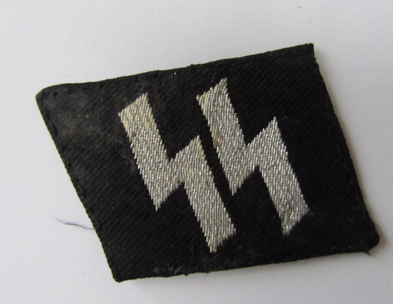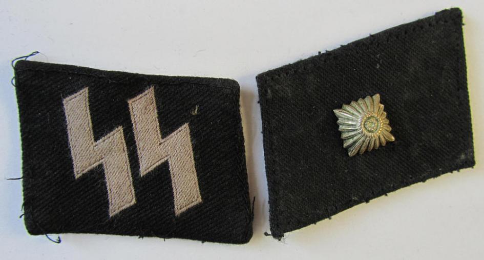 This is a truly rare Waffen-SS 'BeVo'-style collar-tab set, comprising of a runic tab and rare rank-tab, both in a nice, albeit clearly tunic-removed and used condition. It should be noted that the ('BeVo'-style) black linnen rank-tabs are 1000x more scarce than their runic counterparts and almost impossible to find. Both tabs have the white-coloured 'buckram-like' backing as more often observed. I know that this set is highly priced but it should be noted that in 30 years of collecting, I have only encountered a handfull such sets. Both tabs were once attached to a tunic (attached with a machine) and were carefully removed: both show the stitching holes and thread remains. This set - which is not totally matching but very close - was found together as such and I will not separate them and therefore only sell them as a set. Both tabs show obvious wear and age. The rank-tab shows a single metal pip attached, signifying the rank of: 'Waffen-SS Unterscharführer'. A truly nice and rare Waffen-SS rank-tab set: only the fifth such set I ever had on offer!