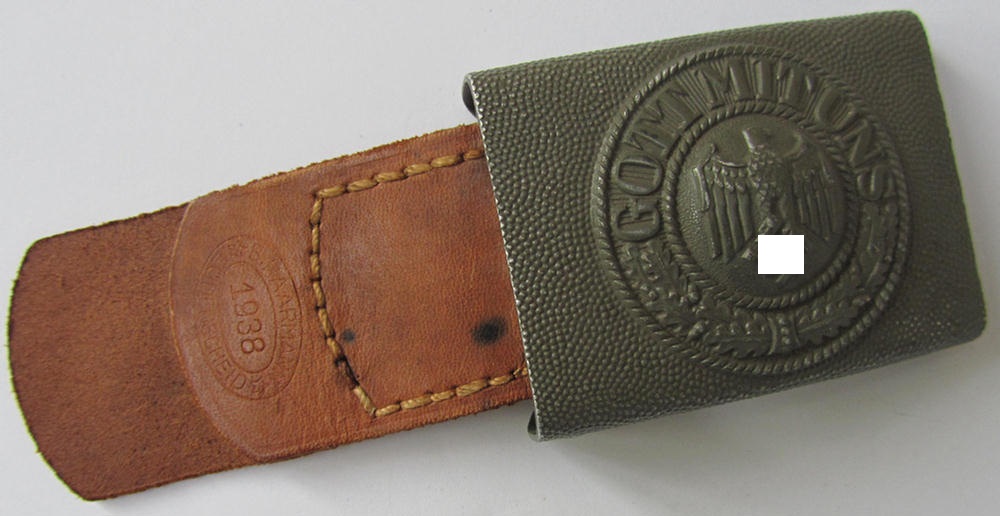 This is a very nice - and truly only slightly used! - WH (Heer) 'pebbled' aluminium, field-grey painted, belt-buckle, that comes on its maker-marked and dated natural leather tab ('B.Haarmann - Lüdenscheid - 1938'), in very nice, almost mint, condition. The buckle was produced by the company of 'B.Haarmann' based in Lüdenscheid. The buckle is in slightly used (almost mint!) condition and retains most of its (field-grey) paint (IMO at least 98%!): it just shows some some minor paint-loss on the higher areas. The - natural coloured - leather tab is also in a very nice and fully functional condition. The leather tab is nicely marked with an oval stamp, showing the company name & date. The buckle itself is not maker-marked or stamped (as is normal for this maker). A truly nice and original buckle which is very hard to find in this nice and untouched condition: most times these are worn througout the war and are polished and shine and are completely void of paint. Simply a nice and actually quite rare buckle!