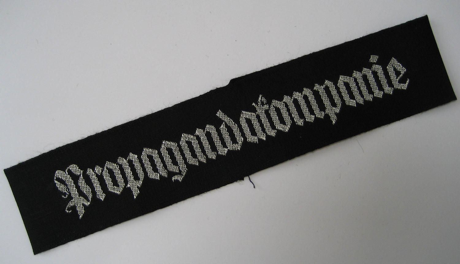 This is a nice example of the rare WH (Heer) armband 'Propagandakompanie' as used by the staff that worked for the various army units that were employed in war-reporting, filming and taking photographs. The - full-length i.e. 42 cms. long - armband is in a slightly used condition and has two unfinished ends. It is is neatly woven in silver on a black cotton background. These bands were worn on the left forearm. A nice and unusal WH armband!