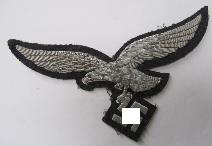 This is a truly very nice and detailed example of a WH (Luftwaffe) hand-embroidered officers'-type, so-called cape eagle, in clearly used but still very nice condition. The eagle - which is IMO only slightly used - is in a nice condition overall: it shows stunning detail (extraordinary embroidery!) and can of course easily be used to restore a LW officers' cape if wished so. The - very decorative! - piece which has a total 'wingspan' of 18 cms. - shows a white-coloured paper backing and also shows a stamped nr. that reads '22' (inventory number?). It should be mentioned that these desirable and rare (!) cape-eagles are often found as (Pakistanian or alike) copies: this is of course a 100% genuine period piece for which I provide a life-time garuantee (it was recently found at a private house-hold). This is the first time I have ever encountered such a rare piece. A nice and rare piece of LW cloth insignia!