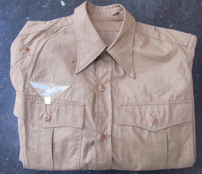 This is a neat and rare 'standard issue' WH (Luftwaffe) item: a tropical, linnen-based, 'under-the-tunic' shirt, still having an originally attached triangular breast-eagle attached, in very nice, ie. stonemint-/unissued condition. This example has the typical long length sleeves and large-sized pointed collar-points. These shirts are considered rare due to the fact that most of them were simply worn-out and used (as normal shirts) after the war. This example bears a clear (black ink-stamped) makers-mark in the neck ('G.H. Brucker') and size-signification ('39') and naturally retains all its originally attached (yellowish coloured) glass-based buttons. The shirt - which is the model with (pleaded) breast-pockets - is just a bit wrinkled (from aging and storage) but really shows no damage whatsoever. There are, however, some truly minor 'rust-stains' visible (nothing shocking though). The shirt has both - originally attached - shoulderboard loops and also shows the button-holes to easily accomodate the 'regular' LW buttons to hold the boards in place. The breast-eagle is also very nice and detailed and was 'factory' attached onto the shirt. It should be noted that this is NOT a modern copy or 'Bunderwehr'-shirt but a genuine WWII item that would certainly show nice under a tropical 'Luftwaffe' tunic or mannequin set-up. A truly rare item: especially in this gorgeous condition!