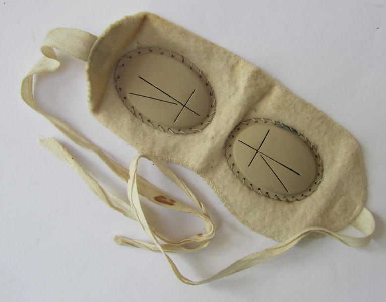 This is a rare pair of tan-coloured (ie. off-white) so-called WH 'Schneebrille' (specific snow-glasses), as used by the 'Gebirgsjägertruppen' (mountain-troops) and or 'Scharfschützen' (snipers), in very nice, IMO mint, unissued condition. The piece is in wonderfull condition and only shows some truly minor aging (and rust-staining) as IMO caused by years of storage: it is naturally fully functional. A nice and surely rare piece of specific mountaintroop-/sniper equipment: the first such item I ever had on offer!