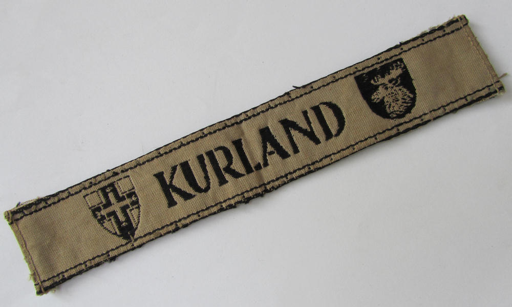 This is a text-book example of the fairly rare and diserable 'Kurland' cuff-title. The armband on offer here is full-length (approx 23 cms.) and both ends are factory sewn as usual (in order to overcome possible fraying). The band is in very nice, only slightly used condition and shows no flaws nor damage whatsoever (it shows some normal staining and wear of having been worn on a tunic once). The cuff-title is executed in black linnen on a white/greyish (also linnen based) background. It should be stated that this is not a commemorative cuff-title (such as the 'Afrikakorps' cuff-title) but an official award that needed official recognition. The armband was handed-out in order to commemorate the fierce battles that took place in the 'Kurland' area in late 1944/1945. A very nice and original example for which I naturally give a life-time garuantee on its originality. A very nice piece!