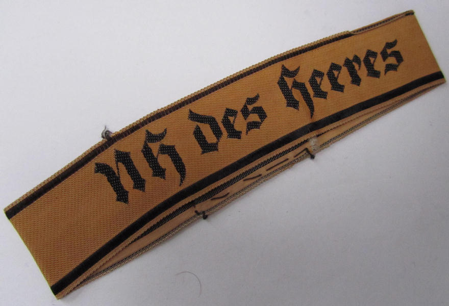 This is a nice - and most certainly rare! - WH female-related item: a golden-yellow toned, linnen-based cuff-title, executed in 'BeVo'-weave pattern, depicting the text: 'NH des Heeres' (= Nachrichtenhelferinnen des Heeres') and having an interwoven 'BeVo-Wuppertal' logo, in clearly used and worn condition. This nice item was intended for wear by female WH signal staff and is not often offered for sale (this is only the second such example I ever had on offer). The cuff-tile - which is in clearly used condition and shows minor wear and age - is IMO period shortened and is still 'sewn together by hand' as issued and worn: it measures in total 29 cms. in length. As stated was this piece most certainly worn and it shows some minimal staining (mostly visible on the back). A very nice and rare women-related cuff-title!