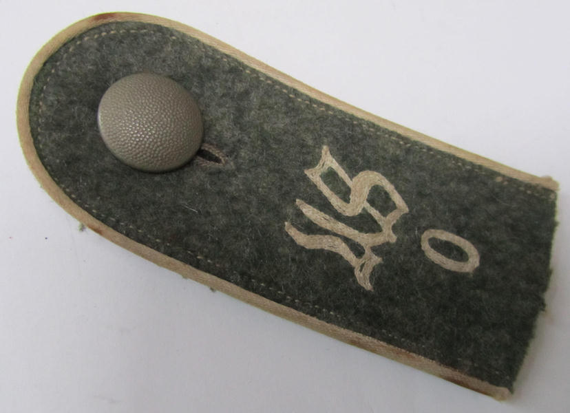 This is a truly rare - albeit regrettably single - WH (Heer) mid-war type, 'cyphered' shoulderboard, as intended for a soldier that served within the: 'Unteroffiziers-Schule O', in nice, albeit clearly used and worn condition. The board - sized: 11 cms. - has a field-grey woolen upper-deck and the white-coloured ('silk-like-type') piping. It also has the 'US' & 'O' cyphers nicely machine-embroidered (in so-called: 'Kurbelstickerei') in white-coloured linnen and was surely a board intended for a regular 'Heeres' tunic. The board - which has no tongue and is IMO 'cut-off a tunic' - shows only minor usage (some minor staining is visible) and wear but is still in an overall nice condition. Of additional interest is the fact that I could not find any NCO school starting with an 'O', making it possibly a 'one of a kind board'. The piece comes with a 'standard' type button as found. Simply a nice (and very rare!) 'cyphered Heeres' infantry-related board!