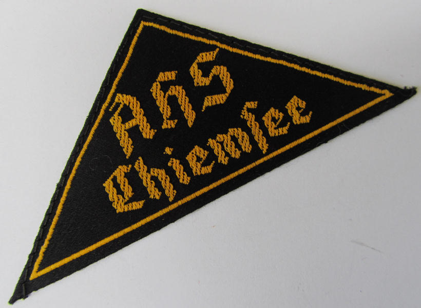 This is a truly nice example of the extremely rare 'Hitlerjugend' (HJ) district triangle entitled: 'AHS Chiemsee', in stonemint, unissued condition. This is a 'male' specimen, indicating that it is neatly woven in yellow linnen on a black linnen background. This one still has its original, paper 'RzM-etiket' attached. It should be noted that the 'AHS' HJ triangles (being intended for the students of the 'Adolf Hitler Schulen') rank amongst the most difficult youth-triangles to encounter. This one - bearing the abbreviation: 'AHS Chiemsee' - was intended for students that belonged to the area ('Gebiet') 'Hochland' ('Mittenwald') and who followed their studies at the 'Ordensburg Sonthofen'. Simply a great opportunity to obtain one of these very rare insignia!