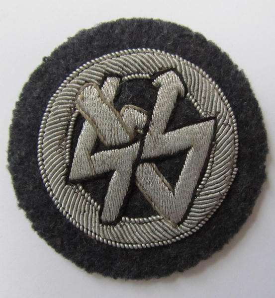 This is a truly rare example of a beautifully hand-embroidered, so-called: 'DLV Traditionsabzeichen für Mitglieder der SA- und SS-Fliegerstürme in Silber', in overall nice, albeit used and clearly worn and tunic removed condition. The piece on offer here has truly very fine detail (it shows extraordinary craftmenship!) and is IMO only sligthly used (it clearly shows the stitching holes, which are visible on the - black-paper backed - back). The badge is executed on a LW-blue woolen background (signifying its 'DLV' usage) and is executed in silver. (There is also a golden-toned variant: this is not a higher grade but simply shows that the bearer was a member of the 'SA- und SS-Fliegerstürme' before 1933). It comes as recently found in a private house-hold (it originated from the same bearer as the 'DLV'-officers-type belt-buckle, which I offer under number 22053. A very nice and rare DLV ie. SS-/SA-related breast-badge!