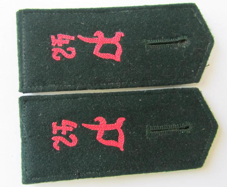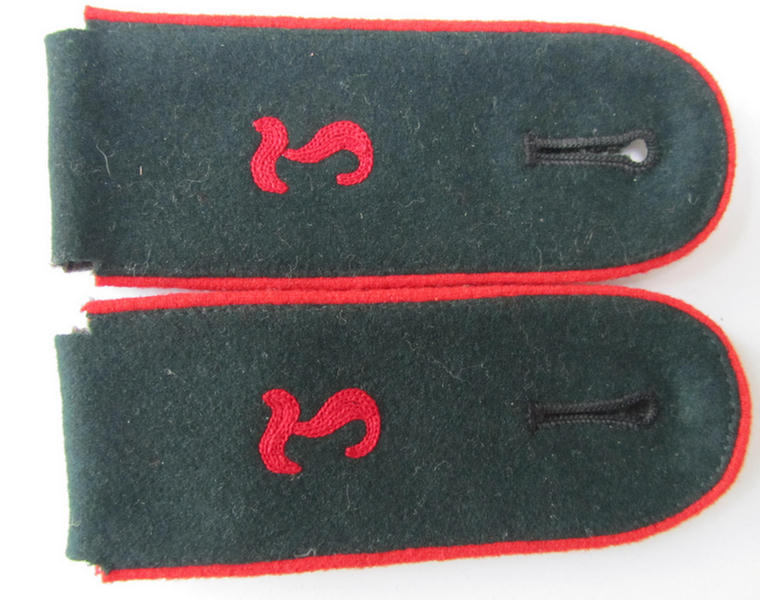 This is a very nice - and fully matching! - early pair of WH (Heer) soldiers'-type, M36-model (pointed style), 'cyphered' shoulderboards, as intended for a: 'Soldat des Panzerjäger Rgts. 42' (soldier in a tank-destroyer-unit numbered: '42'), in nice, albeit slightly used and worn condition. The boards - which measure 10,5 cms. and have naturally no piping - come on their original tongues and are in nice, text-book condition and show only moderate wear and usage. Both have a dark-green woolen upper-deck and show neat machine-embroidered 'P'-cypers and '4' & '2' numerals in bright pink (executed in so-called: 'Kürbelstickerei'). They are only moderately used and show almost no wear (they have truly minimal wear and damage: ie. some tiny holes. Simply a very nice - and actually rare! - pair of early 'cyphered' 'Panzerjäger' boards!