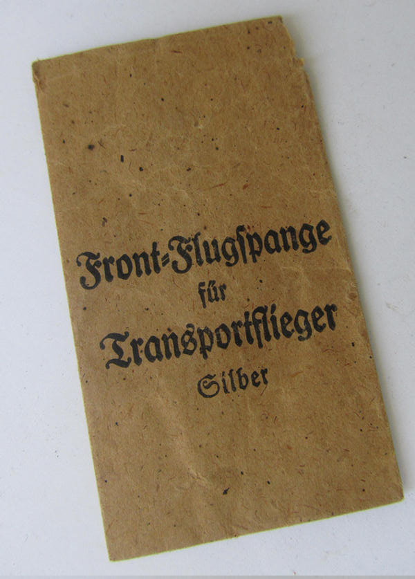 This is a truly unusual and rare little item: a WH (Luftwaffe) carton-based, medal-pouch, as intended for a: 'Frontflugspange für Transportflieger in Silber' (silver transport-pilot clasp), as was produced by the 'Friedrich Orth' company based in Vienna, in overall nice, albeit used & issued condition. The little pouch produced in 'Zellstoff' is overall nice condition: it misses a tiny corner piece (nothing shocking though). It should be noted that the 'Transportflieger' clasps in themselves are aready quite difficult to encounter: I am convinced that this 'simply' pouch is x-times rarer to find. Simply incredible that such a (fairly high) award was handed out in a simple pouch and not in a more often seen etui. Simply a very nice piece of unmistaken rarity!