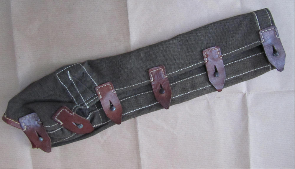This is a rare and desirable equipment item: a WH (Waffen-SS, Heer or Luftwaffe), green-coloured cloth, so-called: 'K98 Systemschutz' (system protector), which is nicely 'WaA' marked, stamped: 'Mod.98' and is bearing a three-digit code & date ('JWA 42'), in truly very nice and only slightly used condition. The (secret) 3-digit code 'JWA' signifies that this item was produced by the company: 'Stecher u. Moritz Lederwerke', based in Freiberg/Sa. The piece - which is constructed of (fairly thick) green-coloured linnen-based cloth and lined with natural-coloured leather - has all 6 leather lashes and 6 metal studs in place (all being undamaged and functional). These desirable pieces saw only limited usage and are therefore rarely encountered. Simply a very nice piece and only the first such item I ever had on offer!