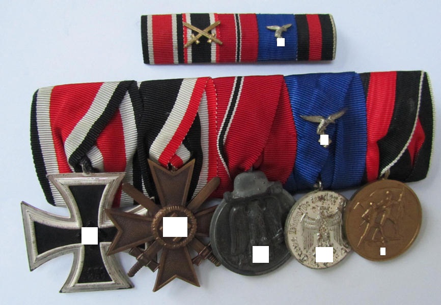 This is a nice and fairly unsusal - truly WWII! - 'Luftwaffe' medal-/'Bandspange' set, that comes as issued, worn and recently found. The 'Spange' shows respectively a WWII EK2 Kl.', a 'KvK 2.Kl. mit Schwerter', an 'Ost-medal', a WH (Luftwaffe) 'Dienstauszeichnung' for 4 yrs. loyal service and a Czech 'Anschluss' medal, all in nice, albeit clearly used & worn condition. All 5 medals - which have extraordinary detail! - were never cleaned nor polished and show some normal age-patina and dust: all five come on their original ribbon as issued and worn. The IC 2nd.class is a decent example that shows some darkened age-patina but still retains its 'hochpolierte Kanten'. I could not check if it is a maker-marked example: the ring is firmly hidden under the ribbon. The piece is nicely 'backed' with field-grey-coloured wool and comes on its functional pin-/catch construction. It also shows a neat (linnen) makers'-etiket that reads: 'Ed.Scherm' based in Nürnberg. It should be noted that this is a true WWII medal 'Spange' and NOT a piece that was post-war assembled. The piece - which comes with its original (and matching!) 5-piece 'Bandspange' - originates from a German household and was never before in a collection. Simply a very nice, 5-piece 'Luftwaffe' medal/'Bandspange' set: ideal to 'upgrade' any tunic!