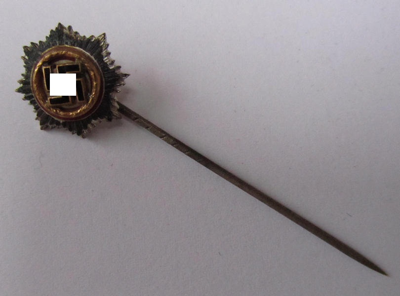 This is a truly unusal item: a rare, (16 mm.sized) miniature lapel-pin, showing a 'Deutches Kreuz im Gold' (DKiG or German Cross), which is nicely maker-marked: 'L57' (= 'Boerger & Co.'), in very nice, and only slightly used condition. The piece comes mounted on its original (long-sized) pin. The piece - which is riveted and is of a multi-layer construction - has truly extraordinary detail and is in a very nice condition overall and has a totally undamaged enamelled centre: it is just amazing how much detail this tiny piece has (also here the pictures do actually no justice to this piece). As stated does the piece show a clear makers-mark ('L/57'), signifying that it was produced by the Berlin maker 'Boerger u. Co'. Simply a very nice and rare piece!