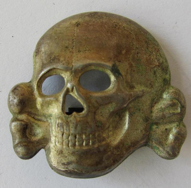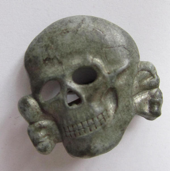 This is a very nice (and nowadays very desirable!) Waffen-SS visor-cap skull, which is executed in so-called silvered 'Feinzink'. The skull is nicely 'Ges.Gesch.' marked and could be IMO referred to the as a text-book 'Assmann' piece. The skull shows only minor wear (it shows a matted, 'zinc' finish) and has both of its (copper-coloured) prongs present. A nice and desirable piece that would look great if again mounted on a Waffen-SS visor-cap!