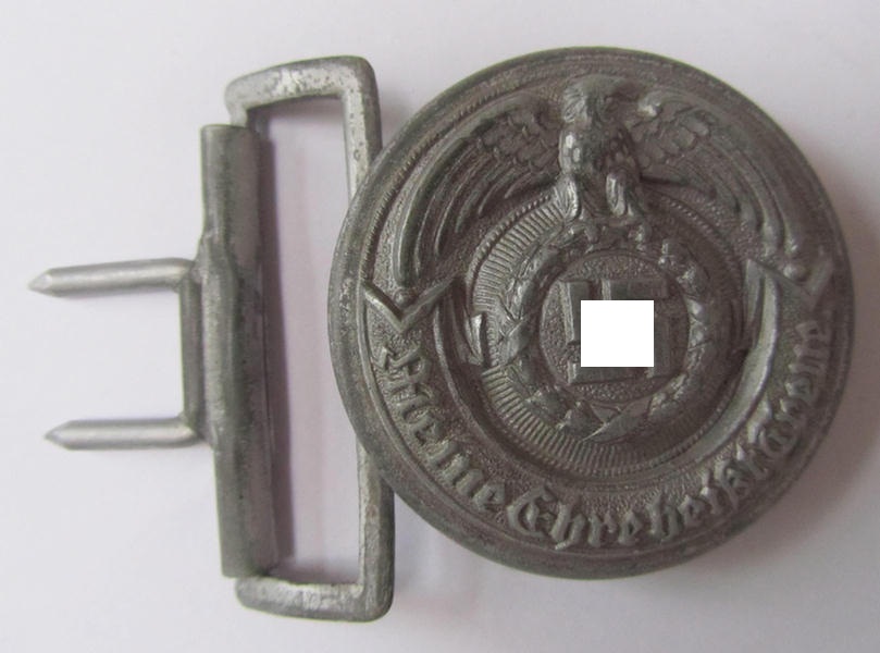This is a nice example of a rare, SS-officers'-type belt-buckle, based in silvered zinc (aka 'Feinzink'), that is neatly stamped: 'RzM'-'SS'-'36/42'-'OLC', being IMO a mid-war example as produced by the 'Overhoff & Cie' company based in Lüdenscheid, in very nice and only slightly used condition. The piece retains most of its original silverish paint - just some normal wear and age is visible - and has IMO never been cleaned nor polished. Of course does this piece have all the characteristics as to be expected on a genuine 'Overhoff' piece. The detail on this piece is simply extraordinary. The first such piece I ever had on offer!