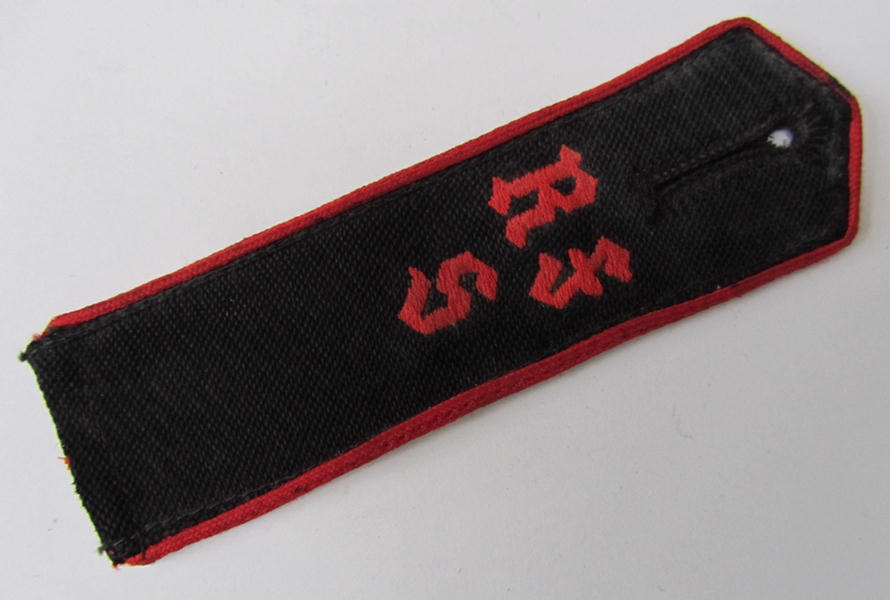 This is a truly very rare - albeit regrettably single - red-piped, HJ ('Hitlerjugend') Reichsfinanz- schulen (RFS) shoulderstrap, as intended for a student (rank: Hitlerjunge), that served at one of these financial schooling institutes, in overall nice and slightly used condition. The strap - executed in black linnen, having the bright-red embroidered characters: RFS and bright-red (rayon-like) piping - comes without tongue (it is of the sew-in type) as found and most certainly worn. The paper 'RzM' etiket is regrettably missing (something which is certainly caused by regular wear). The piece shows some normal age and wear and measures approximately 11 cms. as usual. These (truly very rare!) boards are sometimes incorrectly referred to as being intended for students at so-called: Reichsführerschulen. Simply a very nice cyphered HJ shoulder-strap of great rarity: there are only a few known examples to date!
