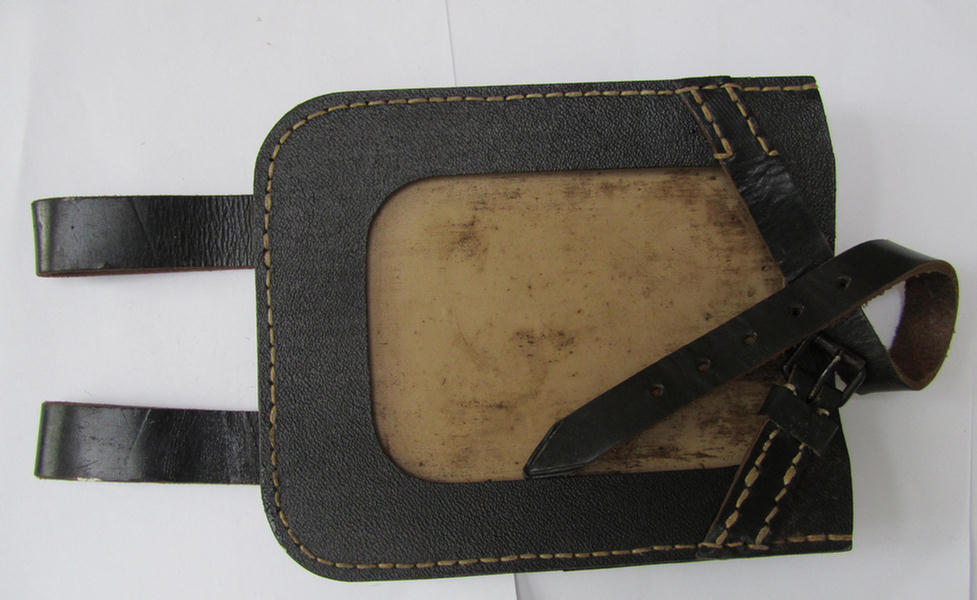This is a scarce, mid-/ie. late-war period, semi-leather (ie. so-called: 'Presstoff'-based) carrying-case, as intended to carry a German WWII shovel or 'Spaten', in truly very nice, only minimal used condition. The piece is in trully excellent condition and is executed in a (more often seen) conbination of genuine leather (lashes) and 'Ersatz'-material (aka: 'Presstoff'). The piece is fully souple and functional and shows no damage whatsoever but misses a date or stamp (which is not uncommon and more often seen): it just needs an - easy to find - 'Spaten' to complete. These are hard to encounter and even more so in this very nice (almost mint!) condition!