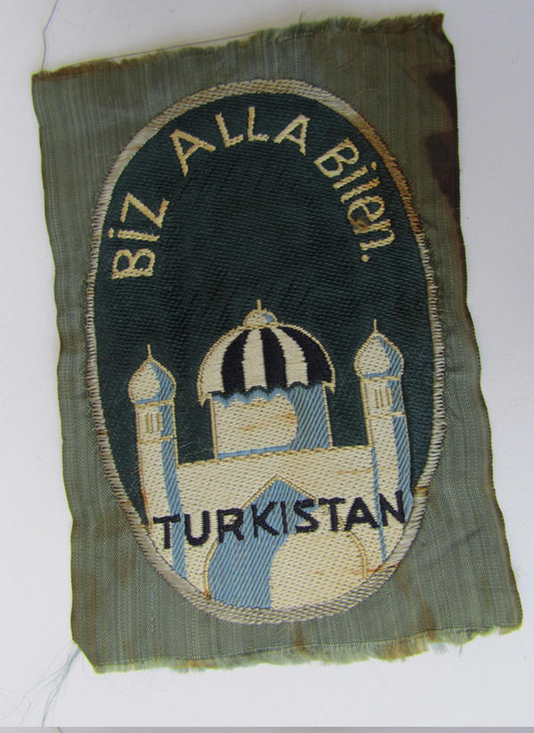 This is a nice and truly very rare 'BeVo' woven armshield of the (rare!) 1st. pattern, as intended for a Turkistan volunteer that served within the Turkistan Legion. This shield originates from a US veteran, who 'liberated' this piece during his stay in occupied France in WWII (according to the vendor). This is one is truly one of the more rarer BeVo shields to encounter. This shield is IMO in unissued condition (it shows however some staining) and is very different from the many copies that are nowadays in existance. This first model (introduced in 1942) saw only limited use and was already replaced by the second model in 1943. A very nice and rare shield: only the second example I ever encountered!