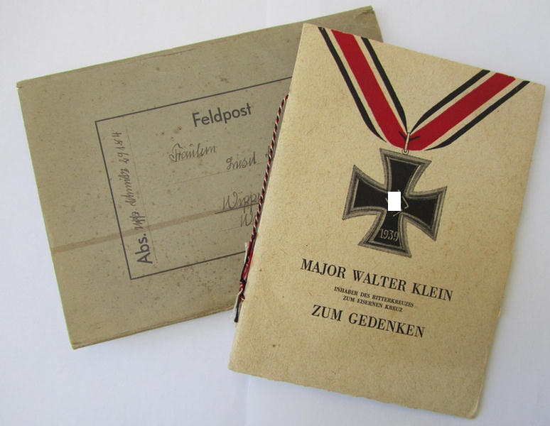 This is a never before encountered - and surely rare! - medium-sized (ie. 20 x 15 cms.), so-called memorial booklet (Gedenkbuch), commemorating the Gebirgsjäger-Offizier and Ritterkreuzträger Major Walter Klein, period sent as a Feldpost package in late 1941, in overall very nice & complete condition. The booklet - which as states commemorates the highly appreciated commander Walter Klein of a Gebirgsjäger (mountain-troopers) unit that served in occupied Norway - gives a full explanation on the career of this officer. Walter Klein won his Ritterkreuz being the commander of the: III./Infanterie Regiment 193 as early as 9 May 1940 and was sadly victim of a fatal accident that took place in the western parts of occupied Norway (on 22 March 1941). The neat booklet - which is executed and printed on high-quality and manually produced paper! - was a (limited edition!) so-called: Truppeninterne Publikation and was issued amongst the members of Kleins unit (ie. 'Kampfgruppe Klein'), that held the fieldpost number: 29184 (being attributed to the: 'Regimentsstab Infanterie-Regiment 193'). The example on offer here was sent home by one of Kleins soldiers: a Gebirgsjäger-soldier named: Unteroffizier Schmitz (most certainly sent in 1941). The booklet holds only 10 pages, amongst which two pages with (nice & detailed!) photographs. A surely nice and rare Ritterkreuzträger-related item: I wonder how many of these booklets have survived!
