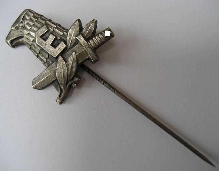 This is a very rare lapel pin related to the NSDAP i.e. its educational system: namely a nice example of the Abzeichen der Staatsschule für Führertum und Politik, which is executed in genuine silver and 900 stamped in very nice condition. This elite institute (which was under the supervision of the NSDAP) was based in Egendorf b. Blankenhain/Thüringen. This special school was instituioned in the 30-ies and was intended to educate the highest level of the (future) NSDAP leaders corps. These lapel-pins were surely issued in a very limited number. The pin has truly extraordinary detail and has a neat inscription and silver content number on the back. The pin is also figured in the Heering/Hüsken lapel-pin catalogue where it is given nr. 4008X: here it is rated with a price of 800 DM! A very rare NSDAP related item!
