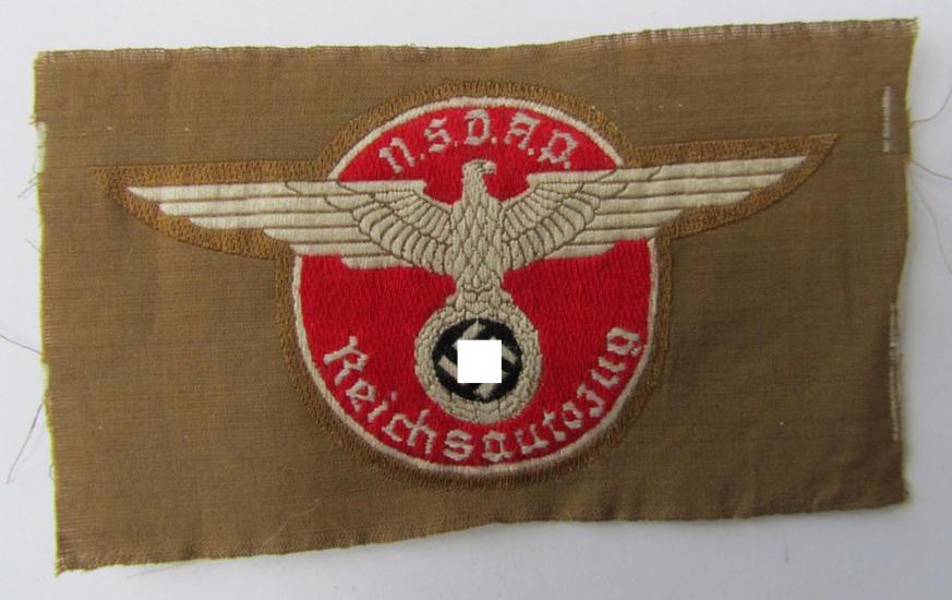 This is a nice specimen of the very rare breast-badge executed in BeVo-weave pattern, as intended for members of the NSDAP Reichsautozug (or: RaZ), in mint unissued condition. The NSDAP Reichsautozug (or: RAZ) was likely the smallest party-related formation within the Third Reich. Although it was a formation that was infact more related to the SA (Sturmabteilungen), it was attached to the NSDAP HQ based in Münich. It most likely never numbered more than 200 members. This organization was in charge of furnishing and setting-up all that was necessary to handle a large-scale party rally. Their responsibilities included setting-up and maintaining audio systems, seating, shelter and housing, field kitchens and latrines. The breast-badge on offer here is a mint, unissued example (which is sized: 11,5 x 6 cms.) that still retains its original paper-based RzM-etiket: it has extraordinary detail and cannot be upgraded. This is the first such badge I ever have encountered. Simply a very nice and rare NSDAP-related badge!