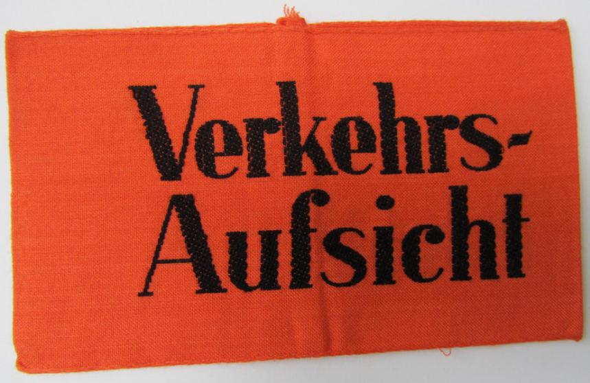 This is a most certainly rare (and never before encountered!) woven WH (Heer) armband, entitled: 'Verkehrsaufsicht', in very nice and only slightly used condition. The bright-orange coloured band - which measures in total 37 cms. and is similarly woven as the common 'Deutsche Wehrmacht' armbands - is beautifully made and a great example of the semi-'BeVo'-weave technique employed by the German manufacturers. I do not know its exact usage (and could not find an exact reference for this item): my best guess is that is was an armband that was worn by auxiliary (and military) staff tasked with obvious traffic-control etc. Its originality is naturally 100% garuanteed. A very nice and surely rare WH item!