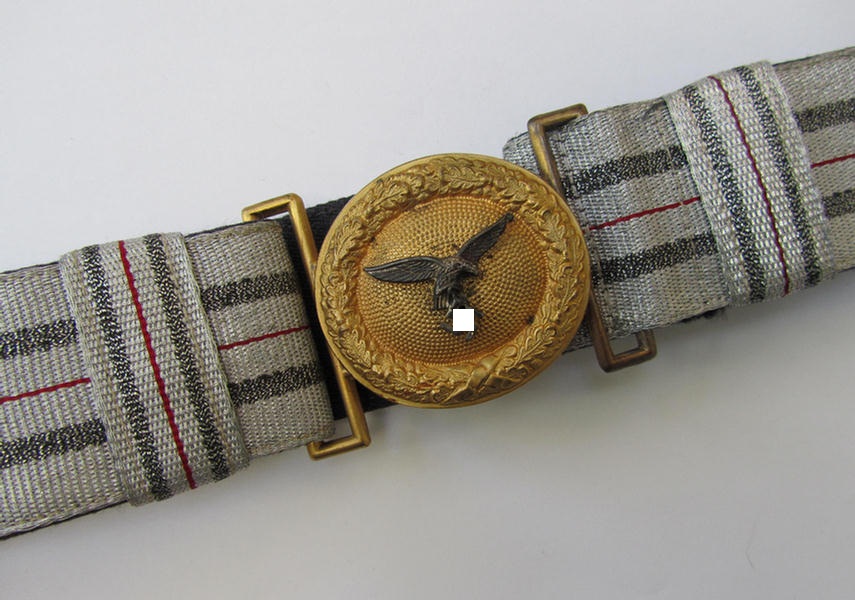 This is a nice and unusual item: a rare WH (Luftwaffe) 'standard' general-officers'-model, dress-type, 'Feuervergoldete' aluminium belt-buckle, that comes on its original 'brocade' belt as issued & worn, in overall nice, albeit clearly used and worn condition. The - truly detailed! - buckle is void of a makers'-mark as is more often encountered: it is still very detailed and is just a bit dusty and dirty. As stated is the buckle executed in 'Feuervergoldet' metal and has a separately attached silver eagle device attached. The early-model (ie. 'down-tail') eagle shows some blackened tarnish. The belt (or 'brocade') is in an overall nice condition: the woven embroidery is extraordinary. The LW-cloth backing shows however some small holes and damaged areas (IMO nothing to shocking though). The belt - that is full-length and can naturally be sized to fit - is 'lined' with blusih officers' type cloth (as per regulation). Naturally are also both 'lashes' present. Simply a very nice piece that was never before in a collection: it was recently found at a private household near Amsterdam: it might originate from a LW General who was stationed in occupied Holland. A great item to complete a 'Luftwaffe generals' 'dress-/going-out' attire: the first such item I ever had on offer!