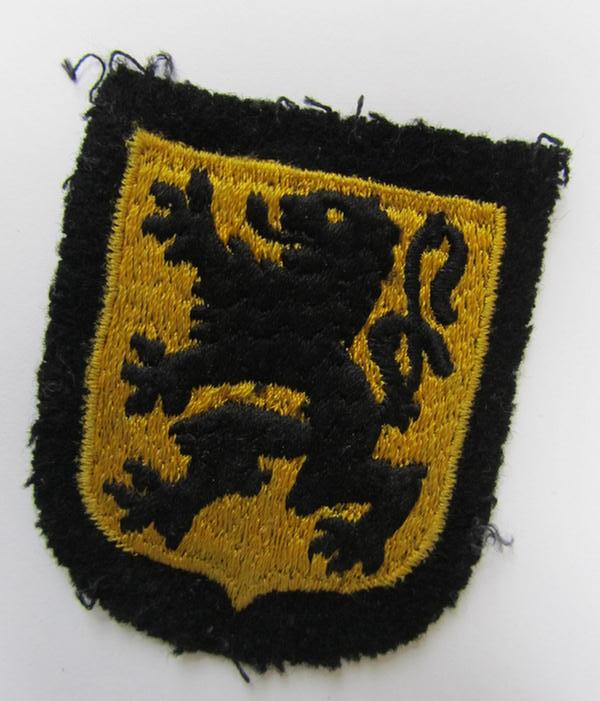 This is a truly rare Waffen-SS, later-war, 'RzM-style' so-called: 'Flandern' arm-shield, as intended for usage by soldiers of one of the regiments of the '27.SS-Freiwilligen-Grenadier-Division 'Langemarck' (or 'Flämische Nr.1'), in nice albeit used and clearly worn condition. The shield depicts the black lion on a yellow back-ground, being the symbol of the Flemish volunteers. This type was most likely introduced in late 1944 for use by the Flemish volunteers. This type is one of the most difficult examples of the 'Dachau series' shields to encounter. The shield is clearly used and tunic-removed: some old threads are still visible. A 100% original and very rare foreign volunteer shield: only the second such shield I ever had on offer!