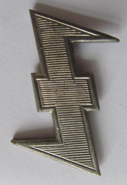 This is a truly very nice example of the rare, Waffen-SS 'flat-wire NCO-type', BeVo-style collar tab, still having its original 'RzM'-etiket attached, in slightly used and clearly tunic-removed condition. The piece is made using a very detailed technique of so-called 'flat-wire' weave, having clear silver interwoven runes on black linnen. The piece - which is as stated slightly used and somewhat dirty - is clearly tunic-removed (stitch-remains still visible and present). This one has the text-book, brown-coloured 'Buckram' backing and has its original paper 'RzM' etiket attached (which also shows the original period price of 0,68 Rm.!. This one shows some minor staining and wear (nothing shocking though). It should be noted that these original and used 'flat-wire' Waffen-SS tabs are much harder to find than their 'mint' counterparts. Simply a nice and rare SS collar-tab!