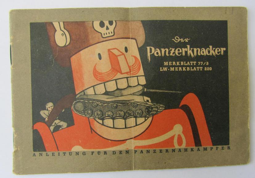 This is a truly very rare and unusual WH, small-sized, instruction-manual, entitled: 'Der Panzerknacker' / Merkblatt 77/3 / LW-Merkblatt 220', which is nicely unit-stamped, in overall nice and complete condition. The small-sized and frargile (soft-cover) booklet (sized: 17 x 12 cms.) helds 24 pages (full of anti-tank- and other destruction methods) and as such makes a superb period reference work covering the subject matter. The manual - which is designed in a more or less comic format - was a very late-war issued publication: I deem that it was first published in October 1944. This particular example bears a neat unit-stamp (of a technical school) and another stamp (in red) stating that it is a brochure that is part of a WH school- library and that it was added to the collection on 21 January 1945. This brochure is equally rare as the other PZ-related period reference entitled: 'Der Tigerfibel'. The booklet is clearly used but fully complete and void of any damage. Simply a very nice and highly collectable 'Panzer'-related item: only the first such publication I ever had on offer!