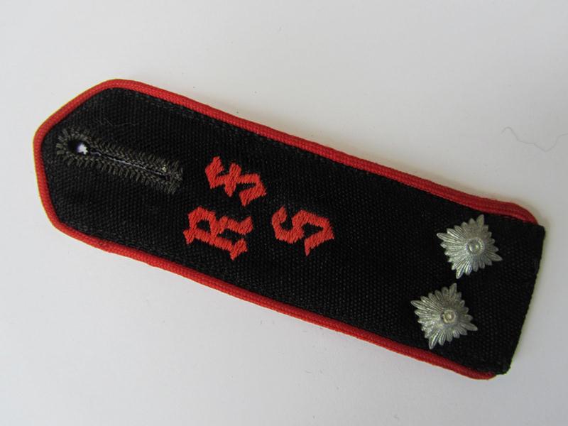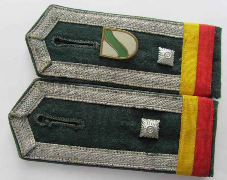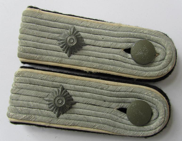 This is a truly very nice - and fully matching! - pair of (IMO mid-war period), Waffen-SS officers-type shoulderboards, as intended for a: 'SS-Obersturmführer der Infanterie' (infantery lieutnant first class), in very nice, albeit sligthly used & minimal worn condition. The boards have the neat (white-coloured) 'silk-like'-type piping, black-woolen underlay and greyish-silver (ie. sub-dued) upper-decks. It also has two originally attached (zinc-based) pips attached (which have lost their golden finish over the years). The set comes on its functional small-sized tongues (which is unusual and rarely encountered!) and is sized: 10,5 cms. The set - which originates from my own shoulderboard collection - was IMO only slightly used: it shows some truly minimal wear and age. The set - which I personally found at a private house-hold several years ago - comes with a set of field-grey coloured, aluminium-based Schraubknöpfe as found. As most certainly known are all Waffen-SS officer-type boards very hard to encounter: those piped in white (Infanterie) having attachad tongues even more so. Simply a very nice and desirable pair of Waffen-SS infantry boards in a truly wonderfull condition!