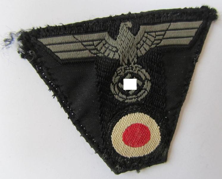 This is a very rare WH (Heer) so-called: 'T-shaped' M42-cap eagle/cocarde, executed in so-called 'BeVo'-weave style, in clearly worn and used condition. The eagle/cocarde is executed in bluish-grey on a black linnen background: thus being specifically intended for the black caps of the 'Panzertruppen'. The eagle is a clearly used and cap-removed condition (some staining and wear is visible) and was (pre-folded) into shape: it is not trimmed. These 'T-shaped' eagles were specifically produced for the impopular M-42 cap, but were used also on the M43 caps. The green T-shaped eagles are already scarce: the black 'Panzer' ones are really rare! This eagle - which is a truly rare example - originates from an old collection of fine, original cap-eagles I recently acquired. I should be noted that these are regrettably often copied: this is of course a fine original. Of additional interest is the fact that this 'T-shaped'-example was worn as being a 'regular' trapezoid, something that is truly uncommon. A very nice and desirable cap eagle: maybe the rarest of the 'PZ' cap-eagles!