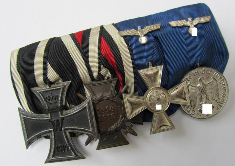 This is a very attractive - and fairly rare! - 4-piece medal-bar (or 'Spange'), showing respectively a WWI EK II. Klasse, a WWI Kriegsteilnehmerkreuz, a (rarely observed!) WH (Heer or KM) loyal service medal for 18 years of service ('Wehrmacht-Dienstauszeichnung 2.Klasse für 18 Jahre Dienstzeit') with attached eagle and a WH (Heer or KM) loyal service medal for 4 years of service ('Wehrmacht-Dienstauszeichnung 4.Klasse für 4 Jahre Dienstzeit') also with attached eagle, all in nice, albeit clearly used & worn condition. All 4 medals have never been cleaned nor polished and retain a nice age patina (the ribbons are also in nice condition and just show minor aging and wear). The medals are just a tiny bit tarnished (caused by years of storage) but have most certainly never been cleaned nor polished. The bar is neatly 'backed' with greenish-coloured wool and also shows a woven makers-etiket that reads: Carl Schweissfurth based in the town of Siegen. The bar naturally also has a functional 'pin/catch' set-up. Simply a nice and attractive 'medal-bar' with an unusal combination: great to present on any 'Waffenrock'!