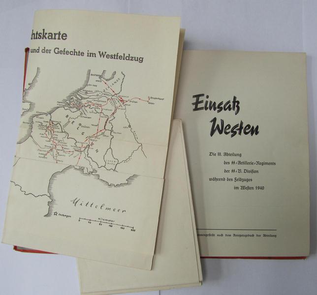 This is a truly rare period internal SS-publication entitled: Einsatz Im Westen & sub-titled: Die III.Abteilung des SS Artillerie Regiment der SS Verfügungs-Division, showing the regimental actions in Holland, Belgium and France during the Western campaign (May to July) 1940, in a very nice and complete condition. This small-sized (hard-cover) book (sized: 21,5 x 15,5 cms.) was compiled following the original Kriegstagebuch (war-diary) of the Regiment and describes the various actions from day-to-day. The book - which was published by the German publisher: Verlag Hamburger Tageblatt - was most certainly not wide-spread and was merely intended as a unique souvenir for the soldiers of this unit (and was not intended for the greater public). As such it can be compared with other scarce publications (ie. Bildbänder) such as Damals and SS Im Westen. It has various (little or not known!) photos and illustrations and also still retains all its four original maps (as issued). The book has 77 pages and also bears a personalised touch: it bears an inked name of the previous owner (on the first page) that reads: SS-Mann Fried. Schneider. The book is so detailed that it even provides lists (and photos!) of the EK2 and EK1 bearers! Needless to state that this is just the first copy of this rare book I ever had on offer: maybe a one of chance to obtain this rare SS-related book!