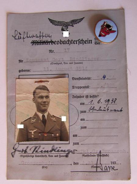This is a very nice - and truly rare! - 2-piece WH (Luftwaffe) grouping, comprising of a neat, blue-linnen Luftwaffenbeobachterschein, issued in 1936 (!) to Leutnant Gert Riedlinger and his rare enamelled LW-Staffelabzeichen, when serving with the: Nahaufklärungsstaffel 1.(H)/11, both in very nice condition. The light-blue coloured & linnen-based (early!) ID-document (which is numbered: 17) shows various entries and stamps: It bears a neat uniform-picture of Riedlinger (born in 1914) and states that he was promoted to the rank of Oberleutnant on 1 June 1938. It also shows that he was transferred to various other units such as a Fliegerschule, as well as to the Aufklärungsgruppe 23, which was also stationed at the Grossenhain airport (visible of page two of the document). The document was always kept together with Riedlingers (semi-official) and rare enamelled Staffelabzeichen, depicting the red devil (Roter Teufel). As stated in the introduction was this decorative badge used by the staff of the Nahaufklärungsstaffel 1.(H)/11 (which was also stationed at the Grossenhain airport). The small-sized badge - which comes on its functional pin-/catch set-up - is truly very detailed and has immaculate (ie. undamaged) enamel surface. It might be one of the only surviving pieces of this badge, something that is reflected in its rarity. I deem that the fact that the badge comes together with its accompanying period ID-document (which backs-up the origin of the badge) makes it a very nice & desirable Luftwaffe grouping. I am pretty sure that this set will remain the only such grouping that I can ever offer. A nice set of unmistaken rarity!