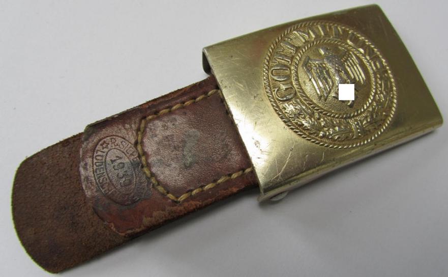 This is a very difficult and scarce buckle to encounter: a truly great example of a WH ('Kriegsmarine') golden-toned, aluminium-based belt-buckle that comes on its original leather tab, as produced by the: 'R.S.& S.' (= 'Richard Sieper u. Söhne') company in 1939, in very nice, albeit sligthly used & worn condition. The company: 'R.S.& S. was IMO the only producer of this type of buckle. The buckle is in a slightly used condition - showing some minimal wear and scratching as usually encountered - but still has most of its golden finish remaining (which is rarely the case!) and is in great shape overall: I would grade the piece as truly very nice. As always does the buckle bears the company logo 'R.S. & S'. (as usual visible under the catch) and is just a bit dirty and was never cleaned nor polished. The (natural-coloured) leather tab is also in a nice and souple condition: it bears the oval R.S.& S. stamp and shows a clear date: 1939. (The tab shows some staining however nothing shocking). The buckle is expensive but IMO fully worth its money: it will be hard to find a better example for a better price!
