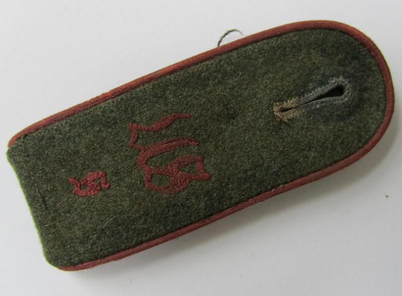 This is a truly rare - albeit regrettably single - WH (Heer), mid-war period, 'cyphered' soldiers-type shoulderboard, as intended for a Panzerjäger (= tank-destroyer) soldier, that served within the: 'Unteroffiziersschule S' (S = Sigmaringen), in very nice, albeit clearly used and worn condition. The board - sized: 11,5 cms. - has a field-grey woolen upper-deck and has the neat bright-pink coloured ('silk-like-type') piping. It also has the 'US' & 'S' cyphers nicely machine-embroidered (in so-called: 'Kurbelstickerei') in pink-coloured linnen and was surely a board as intended for a regular 'Heeres' tunic. The board - which comes on its functional tongue - shows only minor usage (some minor staining is visible) and wear but is still in an overall very nice condition. It should be noted that any US-board is very rare and desirable: those piped in pink even more so! Simply a nice (and truly very rare!) 'cyphered Heeres' Panzer-Jäger-related board that might be a one of a kind board: too bad it is only a single board!
