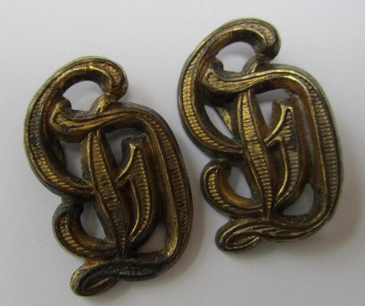 This is a rare - and fully matching! - pair of golden-toned, WH (Heer) (officers'-type) shoulderboard cyphers: 'GD' ('GrossDeutschland'), in slightly used & worn condition. These golden-toned (thus officer type) shoulder-board cyphers were worn on officer-type boards with various branch-colours. The set is (IMO) slightly used and tarnished but has all 4 original prongs present and in place. Both 'cyphers' show some minor discoloration from years of storage and IMO slight wear. The set was never before in a collection and originates from a private house-hold. Simply a great item to keep in a 'GD'-collection or excellently fitted to 'upgrade' a pair of shoulderboards!