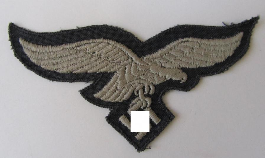 This is a very nice - and IMO truly rare! - WH (Luftwaffe) breasteagle, being of the seldom encountered model executed in silver grey on a 'thin blue-coloured linnen background, as was intended for wear on the LW 'Fallschirmjäger' jump-smocks (Knochensäcke), stonemint, unissued condition. The piece on offer here was surely never used nor worn and simply cannot be upgraded. It shows an 'interwoven rim' reassuring that its borders remain tight and that the piece does not show any fraying. Simply a very nice and rare piece of LW cloth insignia: only the second such piece I ever had on offer!