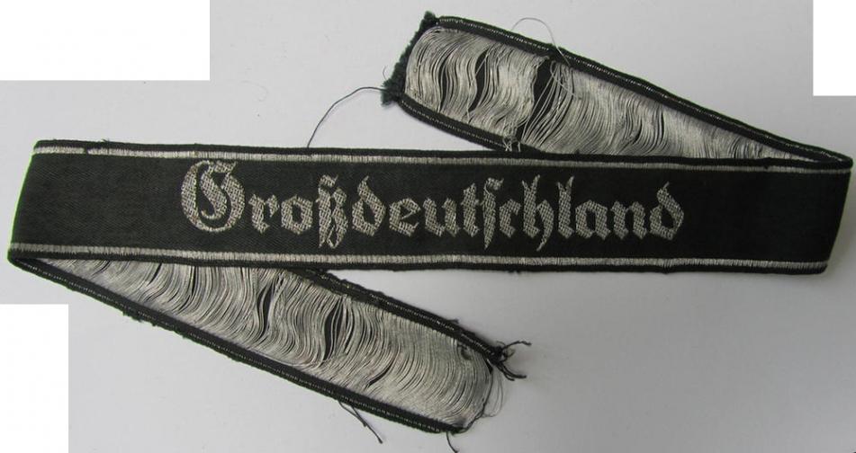 This is a rare - and full-length! - WH (Heer) BeVo flat-wire-woven, so-called: first pattern, 'Grossdeutschland' cuff-title, executed in silver-thread on a darker-green linnen background, in slightly used & clearly worn and tunic-removed condition. These first-pattern GD cuff-titles, executed in flat-wire Gothic script, were only worn for a very limited period of time somewhere in late 1940 and were than replaced by the more commonly encountered examples in Sutterlin script on a black woolen background. The neat example on offer here orignates from a private household where it was recently found. As stated above is it a full-length example (measuring 44 cms.) showing unfinished ends. The piece was clearly issued, worn and tunic-removed: it still shows the signs of having once been attached to a tunic (thread remains are still visible and present!). The armband shows some minor wear and/or age but is in a fantastic condition overall. I have seen these pieces sell for much more than my asking price (which IMO is absolutely correct for such a neat piece). This is the first such rare item I ever had on offer!