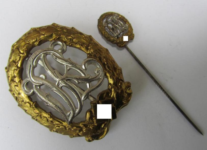 This is a very nice - and actually quite rare! set, comprising of a 'Reichssportabzeichen für Versehrte - DRL (DRL sports-badge for war-disabled) and accompanying miniature, both executed in silver having a golden-coloured wreath and neatly maker-marked: 'Wernstein', both in very nice (IMO mint-/unissued!) condition. Both are of the version showing a swastika. The badges are IMO never cleaned nor polished and both retain their bright and glossy silver- and golden-toned (ie. Feuervergoldete) finish. Both are very detailed and pronounced. The badges are both nicely maker-marked on the back: 'Wernstein - Jena' and show the 'DRGM'-signification as more often encountered. Both pin & catch of the full-sized version are naturally fully functional, whereas the miniature comes on it full-sized pin. A nice - and actually not that easy to find - set of badges: only the first such set I ever had on offer!