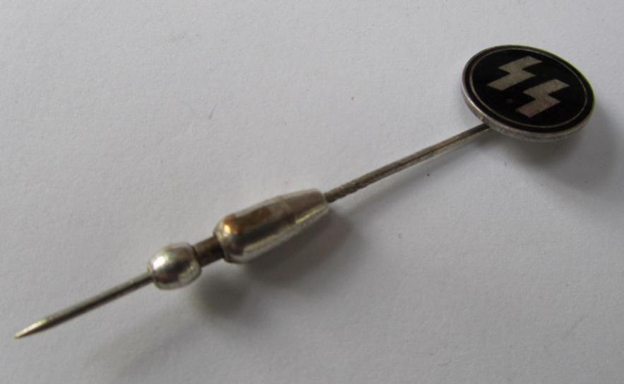 This is a fine (and actually scarce!) tiny ie. 1,4 mm sized miniature enamelled membership lapel-pin, signifying membership within the 'SS', which is maker-marked: 'Hofstätter - Berlin' RzM and individually and unique numbered: '174766', in overall nice, albeit clearly used & worn condition. These 'SS pins where IMO executed in genuine silver and the example on offer here is an example in a nice and only slightly used condition. The (black-coloured) enamel shows no enamel damage whatsoever. As stated is the pin nicely maker-marked and numbered on the back. The piece comes with its original safety-lock as issued and worn. A nice and actually not so commonly encountered enamelled lapel-pin: IMO did I price this fine example fairly!