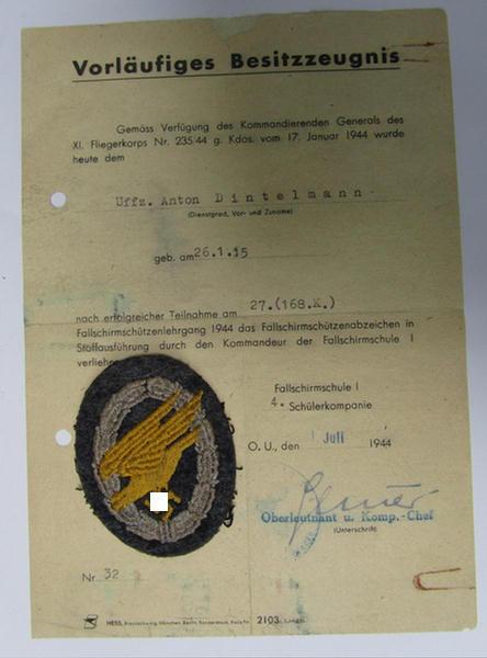 This is a truly very nice - and rarely encountered! - set comprising of a WH (Luftwaffe) Vorläufiges Besitzzeugnis - Fallschirmschützenabzeichen in Stoffausführung' (temporary award-document for a cloth paratroopers jump-badge & accompanying award, both as issued to the Unteroffizier (NCO) Anton Dintelmann on 1 July 1944, both in nice albeit clearly issued condition. According to the document did Dintelmann attend a special jump-course (numbered 27 ie. 168) which he succesfully completed and was therefore given this specific award. The (trule rare!!) - A5-sized - document is a neat Vordrück-example that is neatly filled-in (by a type-writer) and is signed by an (unnamed) Oberleutnant u. Kompaniechef, being the commander of the 4.Schülerkompanie within the Fallschirmschule 1. The document was once folded into four pieces (I deem to be stored in a Soldbuch) and shows some minimal age and wear: it misses one tiny piece on the top but is restored by means of a piece of acid-free tape. The accompanying 'Fallschirmschützenabzeichen' is neatly executed in multi-coloured linnen on a bluish-grey (LW-type) background and is in a clearly used and/or tunic-removed condition. The badge shows some normal age and wear but is of course in an overall fine condition (it still shows the old stitching holes ie. stitching remains). These cloth versions were preferred by the soldiers 'in the field' for obvious reasons. A very nice & later-war FJ-set that shows lots of character!