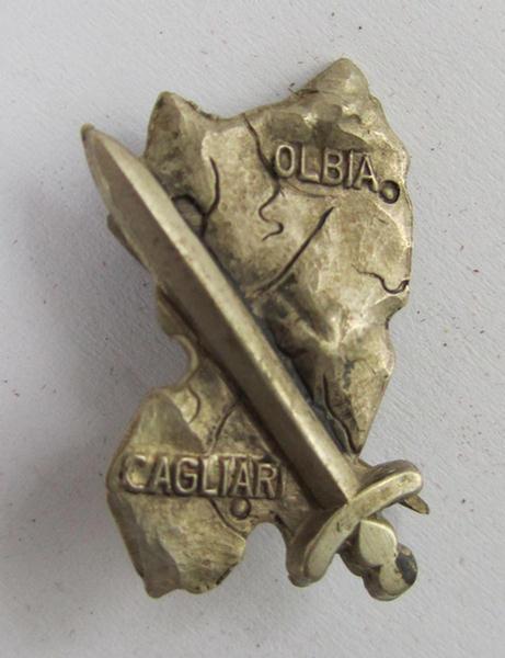 This is a rare & unusual item: a very nice example of the lapel-pin ('Tradition-/Erinnerungsabzeichen') of the '90.Panzergrenadier-Division', or so-called: 'Sardinienschild' (depicting the map of Sardinie with a diagonal sword across) in very nice, albeit sligtly used and most certainly worn condition. The pin is in a very nice, albeit sligthly used condition: it is made of silvered metal and has some slightly darkened age patina. It has IMO never been cleaned and retains most of its silverish finish and detailed appearance. These 'semi-official' pins were worn on both the M43 caps and/or civil attire. The neat pin - which has naturally a functional pin-/catch-set-up - is also figured in the Heering-Hüsken catalogue, wherein it is given a unique number: 9841-a and an estimated value of 380 Euro. Simply a very nice and desirable 'Panzergrenadiere'-related item'!