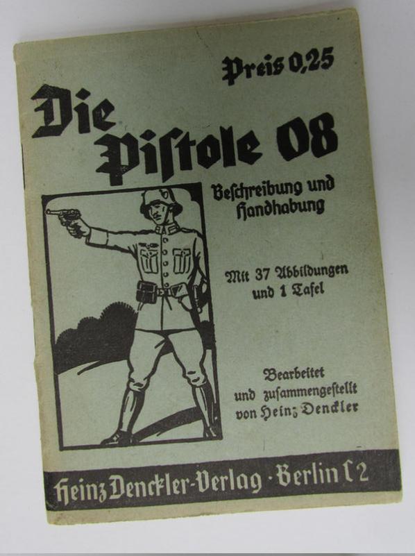 This is a nice example of the rarely encountered and desirable WH instruction-booklet, entitled: 'Die Pistole 08 - Beschreibung und Handhabung' (= instruction-/training manual for the Luger pistol), in nice and only slightly used condition. The small-sized booklet - sized: 14,5 x 10,5 cms. - is fully complete and retains all its 34 pages and included folded-out poster (aka: Tafel). It is just somewhat yellowed caused by normal age and years of storage. As possibly known has also this booklet been reproduced: this is naturally a fine original and period example! The booklet provides the reader with text and (37!) illustrations with a complete insight on properly using the standard WH P08 pistol and all its accesoiries. These publications were not 'standard 'issue but had to be privately acquired by the soldiers ie. NCO's and officers. Simply a nice and fairly rare publication: it is just the first such piece I have ever encountered. The piece also bears a personalised inked name: it once belonged to a certain: 'Walther Plagge' (or alike). A truly great addition to a field-gear/mannequin set-up!