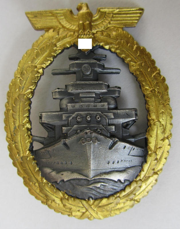 This is a very nice WH (Kriegsmarine) 'Flottenkriegsabzeichen' (high-sea fleet badge), that is nicely maker-marked: 'Fec. Adolf Bock - Ausf. Schwerin Berlin', in extremely nice (IMO virtually mint, unissued!) condition! The very detailed badge retains all its golden finish (IMO 99%) and is nicely maker-marked as stated above. The badge is executed in so-called: 'Buntemetall' ie. 'Tombak' and has of course a functional (flute-shaped) pin and catch. The badge was never cleaned nor polished and has truly extraoridinary detail. Almost impossible to find a better example!