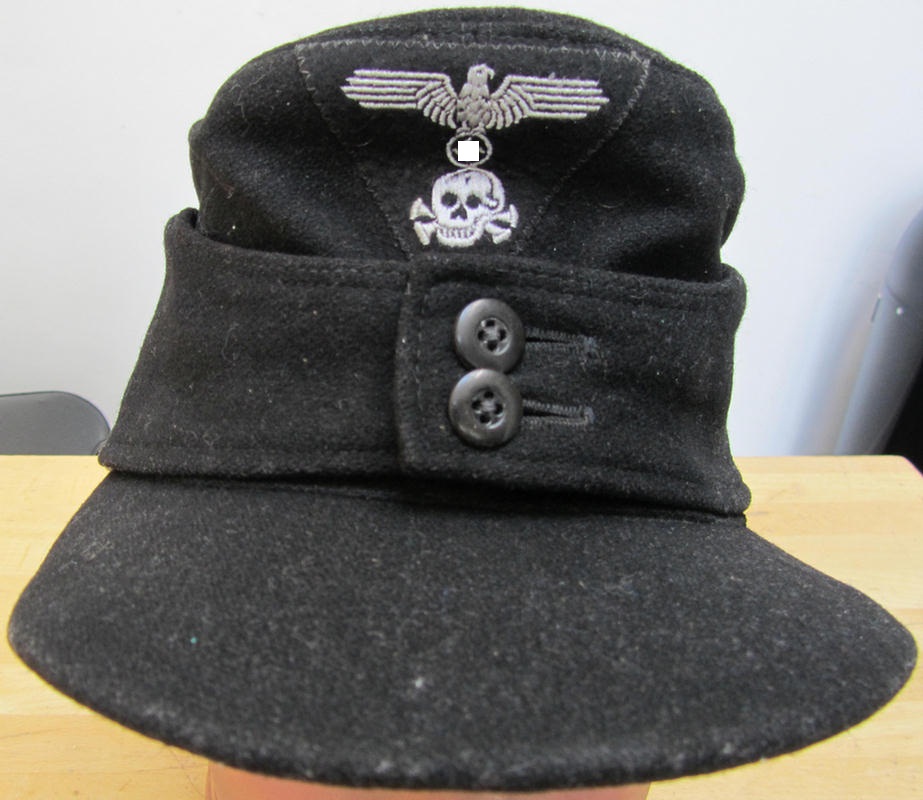 This is a very nice and rare item: a late-war Waffen-SS Panzer black-woolen M43-cap, having a black (woolen) eagle/skull trapezoid originally attached, in very nice and only slightly used (almost mint) condition. The cap - which is in all facets a typical 'Dachau' produced cap - is full text-book and is in a very nice condition. All details are 'text-book' for a 'Dachau' made piece: like the small side loops, the two black-coloured 'Bakelite' buttons, the greyish linnen lining (in so-called: 'fishbone'-pattern) and the typical not covered (hard carton) underside of the flap. It is a fair size (56) - which is also ink-stamped in the lining - and will certainly fit a mannequins' head. The black so-called 'pirate' trap is stitched-on by using a 'zig-zag' pattern stitching: of course was this 'factory done' and was the lining later attached (so no stitching is visible on the inside). The piece was IMO only slightly worn and shows some minimal wear and staining. Simply a fantastic Waffen-SS Panzer M43-cap for which I naturally provide a life-time garuantee on its originality. I have priced this one accordingly to its rarity! A very nice item!