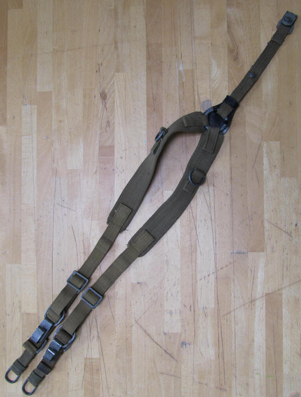This is a rare pair of genuine, linnen 'webbing' ie. tropical 'Y-riemen', as used by the DAK, nicely marker-marked ('Ehrhardt u. Kirsten' based in Taucha) & dated: '1941', in overall nice, albeit clearly used condition. The piece is naturally complete and comes with its original 'end-piece', which is also executed in woven 'webbing'. The piece is constructed from various pieces of linnen 'webbing': some parts are more yellowish than green (something that is not unusual). All metal parts retain most of their bluish-grey colour but do show some normal wear and regular damage caused by wear (no rust though). The piece is - as stated - nicely marker-marked and dated (on the black-leather middle piece). These 'Y-riemen' were naturally worn throughout the war but these early and clearly dated pieces can be surely attributed as being used by members of the 'Deutsches Afrikakorps' (DAK). This piece originates from a German flea-market and was never before in a collection. Simply a very nice piece of tropical equipment: the first such item I ever had on offer!