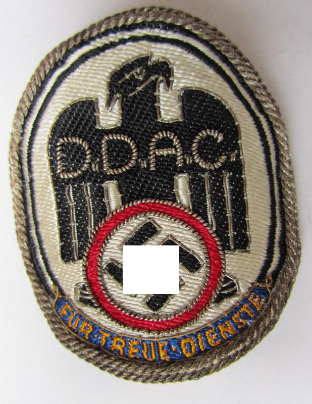 This is an unsual - and never before encountered! - hand-embroidered, medium-sized, 'brooch' (having a height of 7 cms.), intended to signify loyal membership ('ie.'Treue Dienste')within the 'D.D.A.C. (= 'Der Deutsche Automobil-Club' or German Automobile Club), in nice and only slightly used condition. The 'brooch' (or placque) - which is quite converse and has a functional attachment 'clip' - shows extraordinary detail and craftmenship: it shows the 'D.D.A.C.' symbol (the eagle) and bears under that the text: 'Für Treue Dienste' (for loyal service). The piece is void of a makers'-mark. A very nice and most certainly rare item: maybe a 'one-of-a-kind' placque!