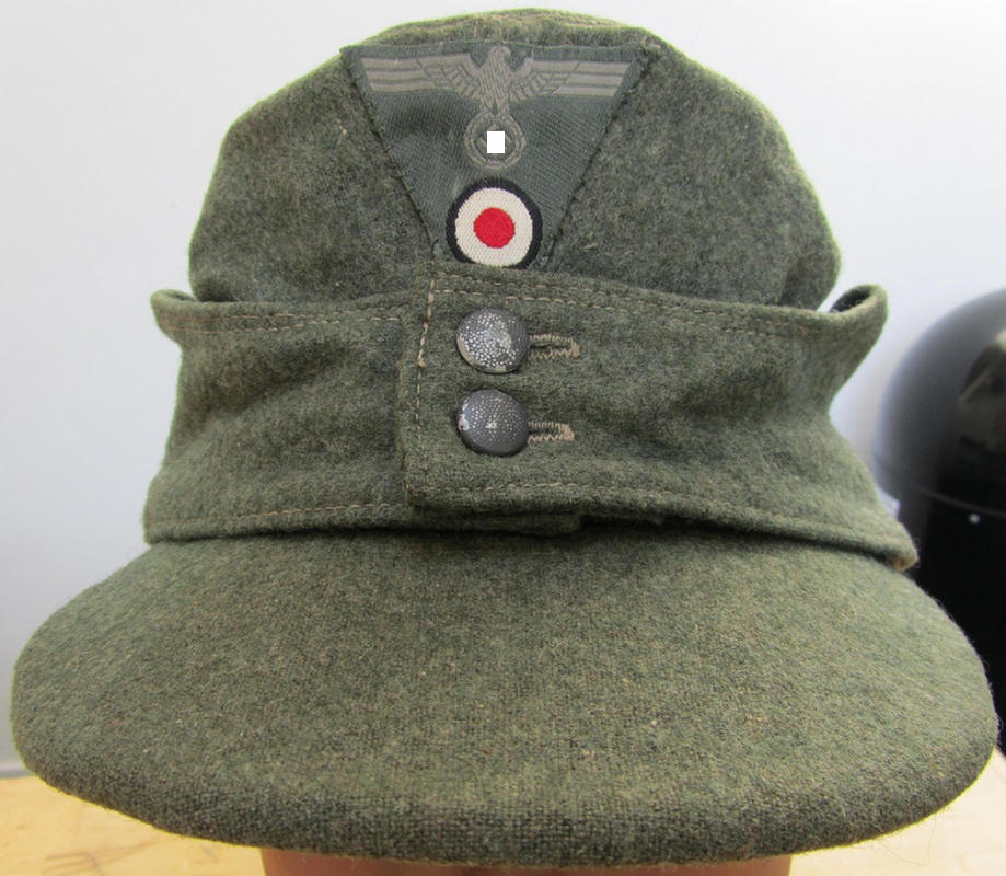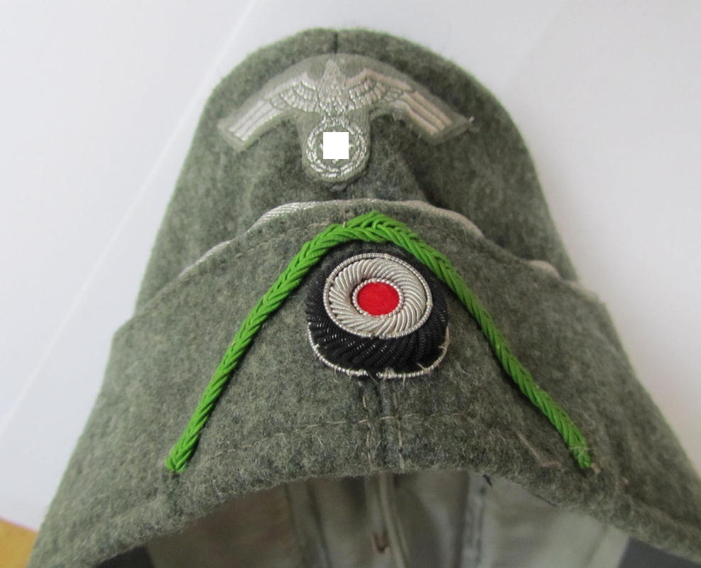 This is a very nice example of a tailor-made M38 officers' model side-cap, as intended for - and worn by - an officer in a WH (Heer) Panzergrenadiere (= rifle-regiment) unit, in very nice and only slightly used condition. The piece is truly awesome and was only slightly worn: it has the bright-green 'soutache' attached, a hand-embroidered thicker model officers-type cocarde and silverish 'flat-wire' eagle, period (hand-) attached. The Soutache is truly unusual: it is made of somewhat thicker braid. The cap is in great nick (not damaged whatsoever) and has a (partial) greyish leather sweat-band and light-blue/greyish coloured (linnen-based) lining. It is void of a size- or makers-stamp but I deem it a fair size (57/58 or alike). It also has a safety-pin in place (which was attached in order to create a more 'folded format' of the cap). The cap is a 100% period 'tailor'-made piece and actually quite rarely observed in this desirable branch-colour. Simply a very nice piece of Officers head-gear!