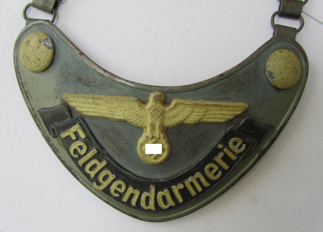 This is a nice example of the scarce WH (Heer) 'Feldgendarmerie' (field-police) gorget ('Brustschild') that comes on its original metal chain as issued and worn, in overall nice, albeit clearly used and worn condition. The piece - which still retains most of its fluroriscent paint - has a 'carton-based' backing (which is most often the case) and is void of a makers'-mark or date. The piece - which is quite heavy and fabricated from metal (not aluminium) - shows normal scratches and traces of age and fair wear. It has IMO been cleaned (period?) and some of the silverish paint visible on the shield is missing ie. cleaned off. The piece shows some dirt and rust-spots but nothing shocking though. In any case an original and truly worn example that IMO is priced accordingly.
